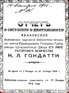 Долгие годы считалось, что биография Ивановской библиотеки началась в августе 1920 года. Но совершенно случайно в Государственном архиве Амурской области был обнаружен уникальный документ — «ОТЧЕТ О СОСТОЯНИИ И ДЕЯТЕЛЬНОСТИ ИВАНОВСКОЙ БЕСПЛАТНОЙ НАРОДНОЙ БИБЛИОТЕКИ – ЧИТАЛЬНИ им. ПРИАМУРСКОГО ГЕНЕРАЛ — ГУБЕРНАТОРА ШТАЛМЕЙСТЕРА ДВОРА ЕГО ИМПЕРАТОРСКОГО ВЕЛИЧЕСТВА Н.Л. ГОНДАТТИ» 1916 года. Из этого отчета следует, что двери избы-читальни в селе Ивановском впервые открылись 19 декабря 1913 года.