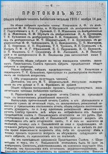 0 ноября 1916 года председатель Совета П. Шереметьев выступил с докладом «Задачи библиотеки-читальни на будущее», в котором говорилось о роли внешкольного образования в воспитании подрастающего поколения. Вот несколько цитат из него: