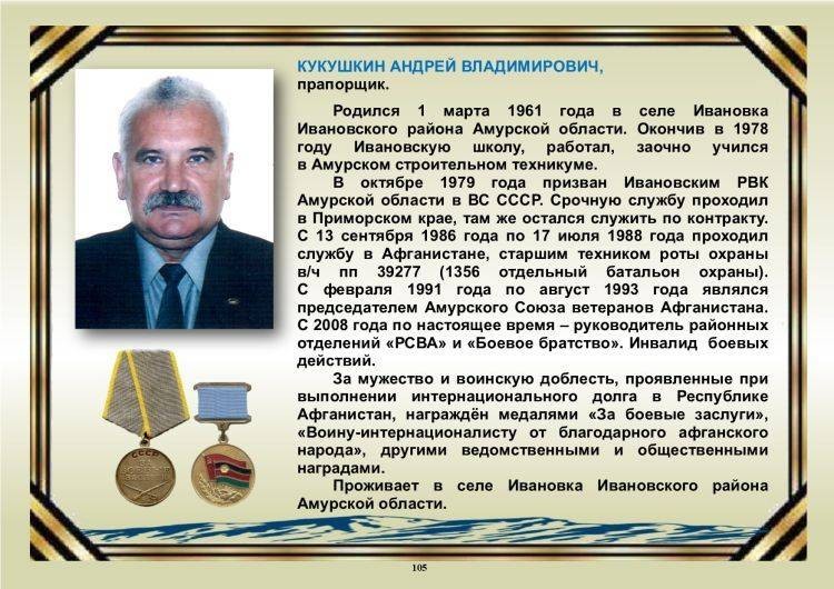 Указом президента России медалью ордена «За заслуги перед Отечеством» 2-й степени награжден Андрей Владимирович Кукушкин — руководитель Ивановского отделения «БОЕВОГО БРАТСТВА» Амурской области.