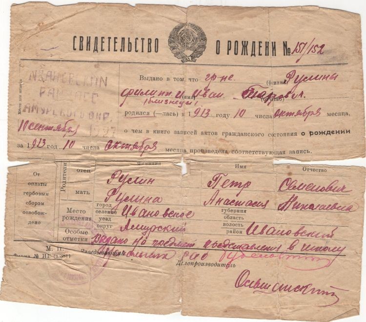 ПОЯВИЛСЯ я на свет здесь, в Ивановке, 10 октября 1913 года в семье крестьянина. бедняка Рулина Петра Семеновича. А Рулёвым я стал уже когда в школу ходил. Сидел за одной партой рядом с двоюродным братом Павлом Рулевым, с сыном брата моего отца. Только вот он . Рулёв, а я Рулин. Однажды спрашиваю отца: «Тятя, почему так: Пашка. Рулёв, а я Рулин?». «Рано тебе, сынок, лезть в эти дела, — отвечает. — Я Рулин потому, что это я могу всегда написать. А Рулев я не знаю как писать. Вот и все». «А что, — спрашиваю, — если я скажу Марии Ивановне — нашей учительнице, чтобы она и меня записала «Рулёв»? «Ну скажи. А я так и буду Рулин. Шо тут такого?». Мария Ивановна послушала меня и Пашку. Пообещала Пригласить отца и Пашкину мать и выяснить правду. С тех пер я начал носить фамилию Рулёв. А отец остался Рулин. Так и было до весны 1930 года, когда в Ивановке начинали создавать колхоз-гигант имени Сталина Отец решил вступить в колхоз и велел мне написать заявление Я написал, но не от Рулина. а от Рулёва Петра Семеновича. Ну а он расписался Рулин. Паспортов тогда не было, и фамилию подтвердить только родственники могли; а вводились паспорта, меня в Ивановке не было, я был на Камчатке