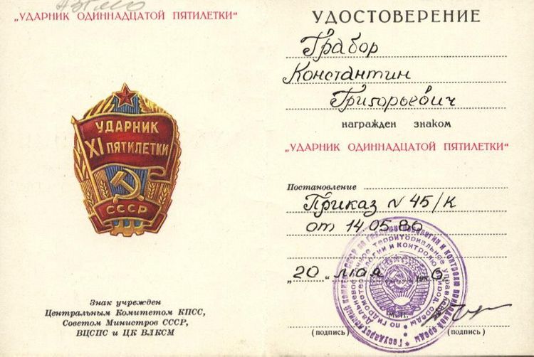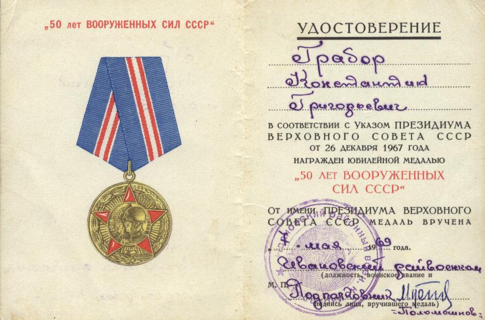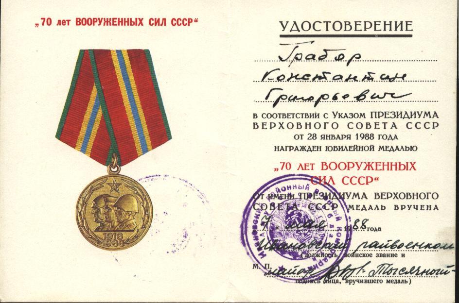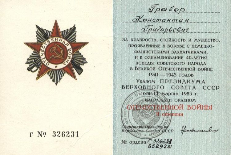 Грабор Константин Григорьевич родился 14 мая 1919 года (16 февраля 1996г). Призван в армию в августе 1939 года в 102-й пушечный артиллерийский полк. Отслужил в армии 7 лет. Демобилизован 15 июня 1946 г.