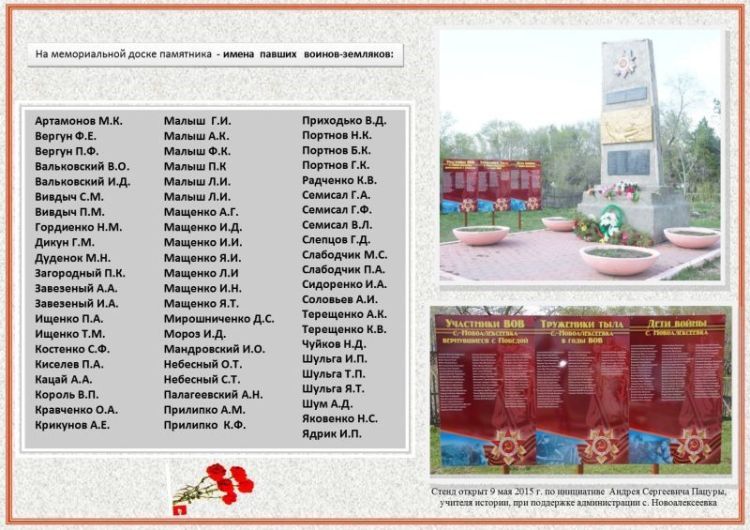 Памятник воинам, погибшим в годы Великой Отечественной войны, расположен в самом центре Новоалексеевки. На двух мемориальных досках Памятника высечены имена погибших односельчан. 65 фамилий. Мы решили узнать их судьбу. Обратились к документам, которые хранятся в школьном музее Новоалексеевки.