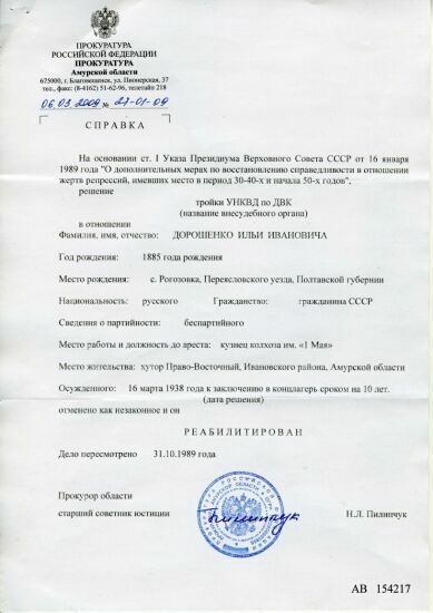 Во втором томе книги «Памяти жертв политических репрессий», я нашёл запись под номером 7010 о Дорошенко Илье Ивановиче.