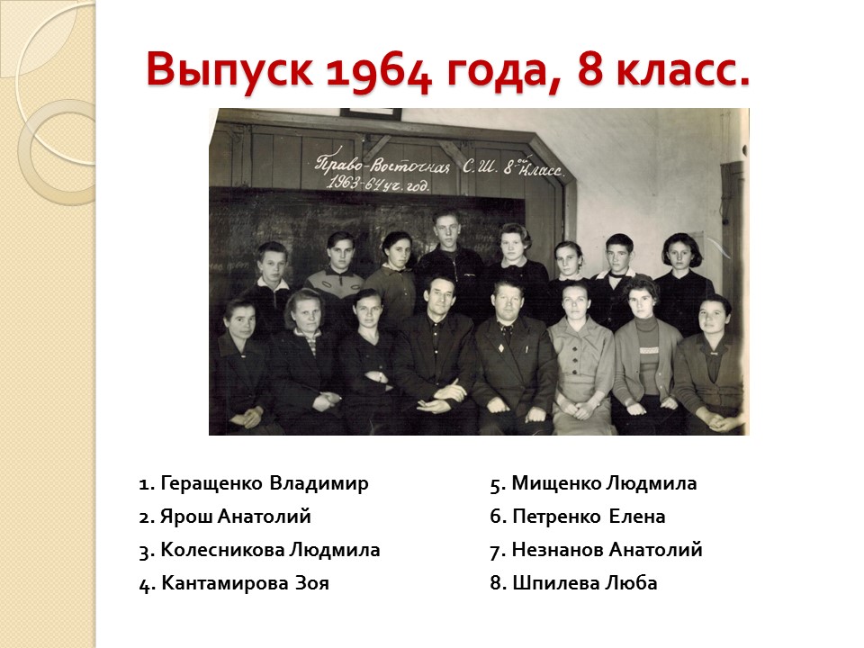 История школы похожа на тысячи других по всей России, но и уникальна одновременно. Младше самого Правовосточного она всего на семь лет и основана в 1928 году. Это был маленький домик, состоявший из одной классной комнаты, крошечного коридора и маленькой комнатки для учителя. Первым учителем был Иван Александрович Заикин. Шли годы, менялись учителя и ученики, но школа оставалась маленькой однокомплектной до 40-х годов. Незадолго до войны стала двухкомплектной, в которых уже работали две молодые учительницы — Екатерина Захаровна Седельникова и Таисия Сергеевна Иванцова.